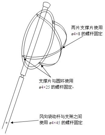 | 1、先將風(fēng)袋套上不銹鋼圈。 2、再將套上風(fēng)袋的鋼圈開口向下用?4*25mm固定在動(dòng)桿上。 3、如下圖所示安裝支撐片。 4、將動(dòng)桿插入支架,用?4*45mm螺桿固定。 5、將支架固定在底座上。 | ![]() |